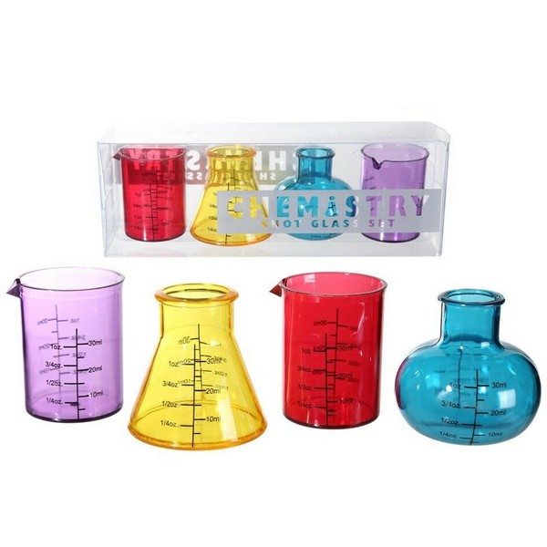 This set Chemistry lab themed plastic shot glasses are the addition to any party. Included are four fun and bright coloured acetate shot glasses shaped like common chemistry measurement glasses, beakers and flasks.